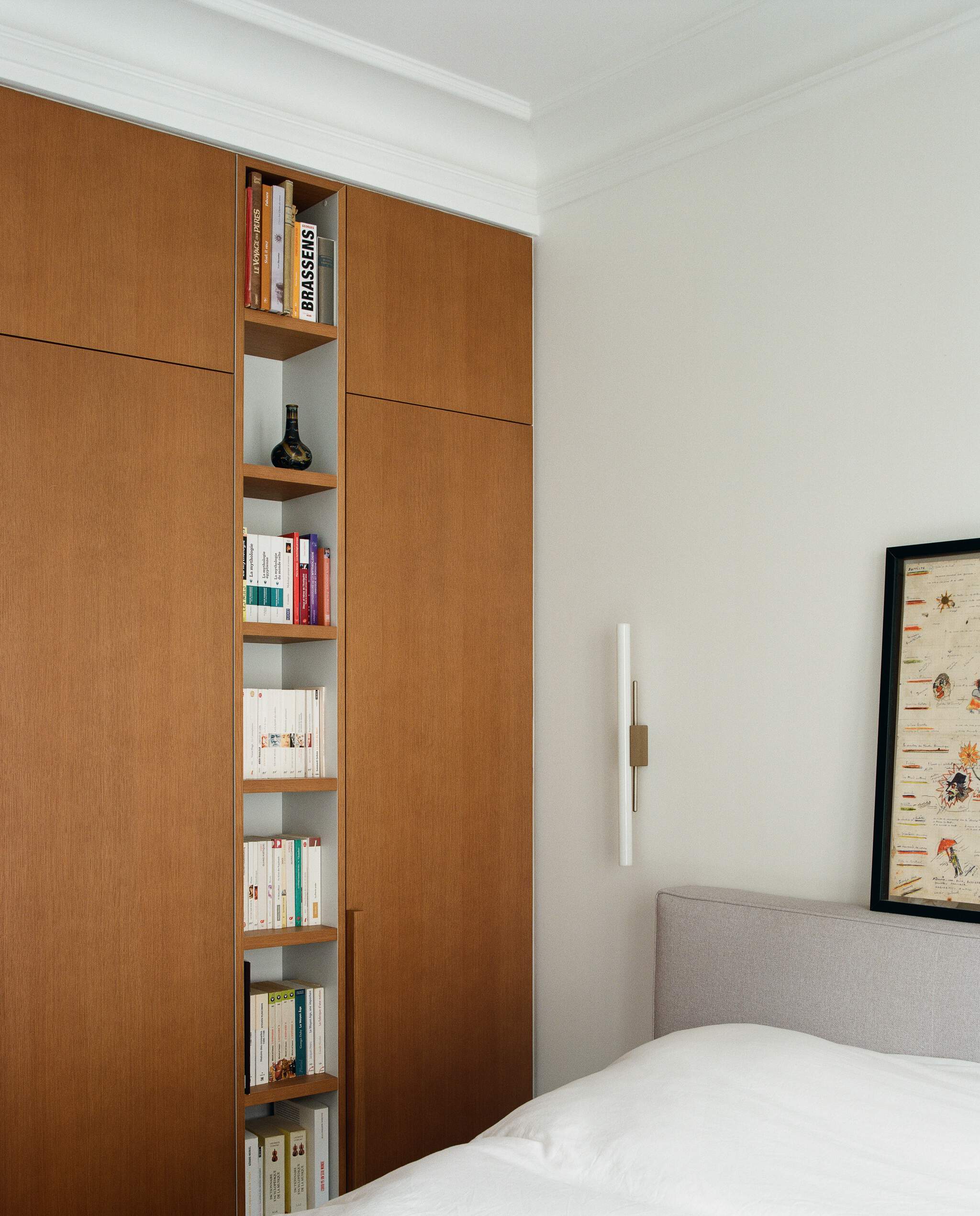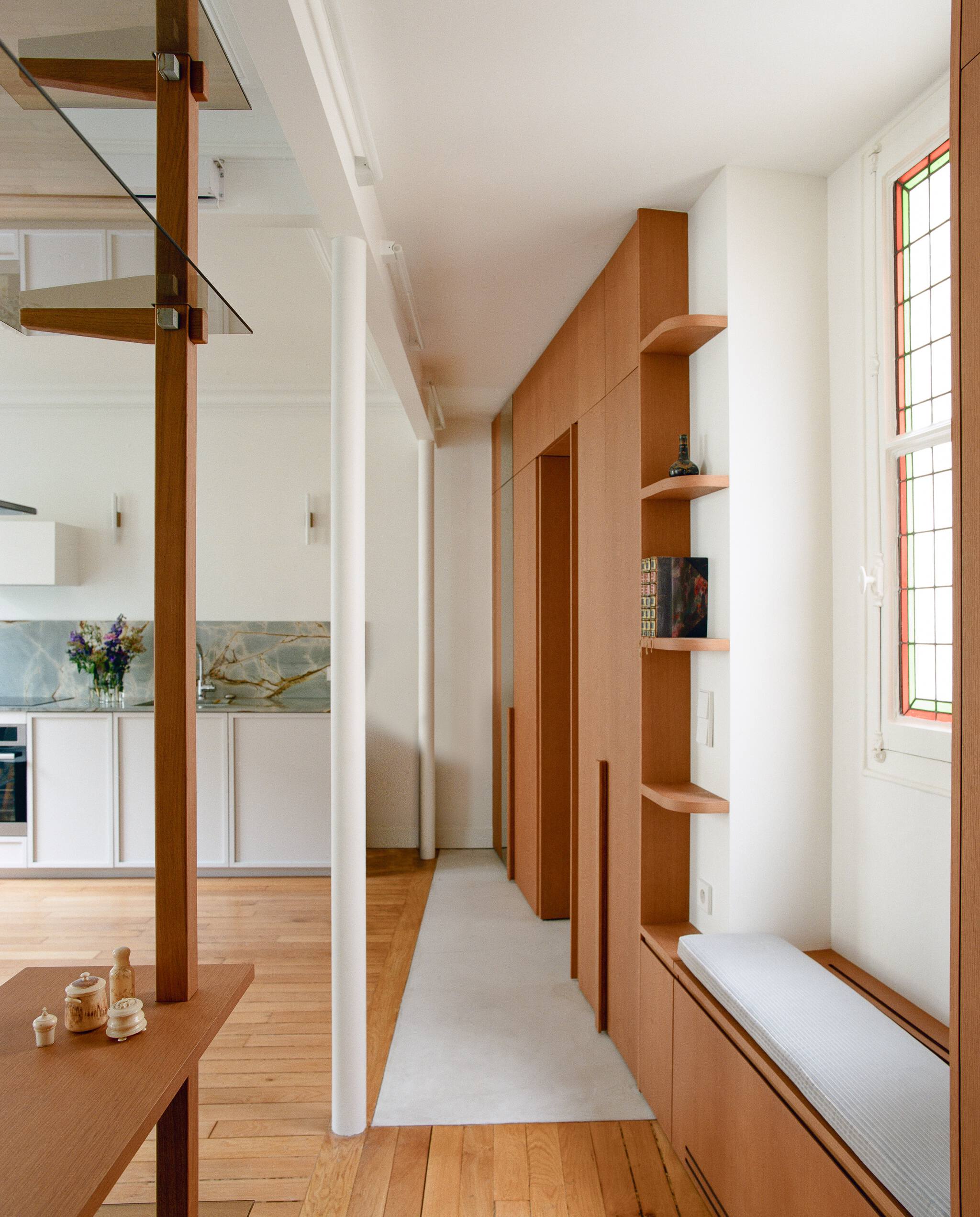1. décloisonné, l’appartement est structuré dès l’entrée par une enfilade en chêne réalisée sur mesure. La progression dans les pièces de vie se fait le long de ce meuble accueillant à la suite: une penderie, une banquette d’entrée, une tisanerie, un accès dissimulé vers la salle d’eau et de nombreux rangements pour la cuisine.